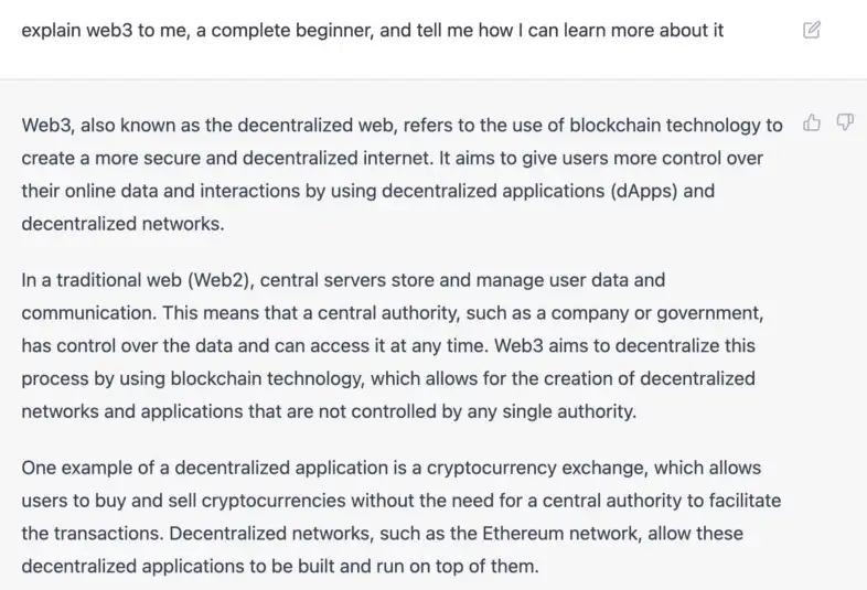 - dApps การวิเคราะห์เชิงคาดการณ์ — สามารถใช้ ChatGPT เพื่อสร้างการคาดคะเนและข้อมูลเชิงลึกในภาษาธรรมชาติโดยอิงจากข้อมูลจากบล็อกเชน ทำให้ผู้ใช้มีวิธีที่เข้าถึงได้มากขึ้นและใช้งานง่ายในการวิเคราะห์และทำความเข้าใจข้อมูลที่ซับซ้อน — OpenAI ChatGPT