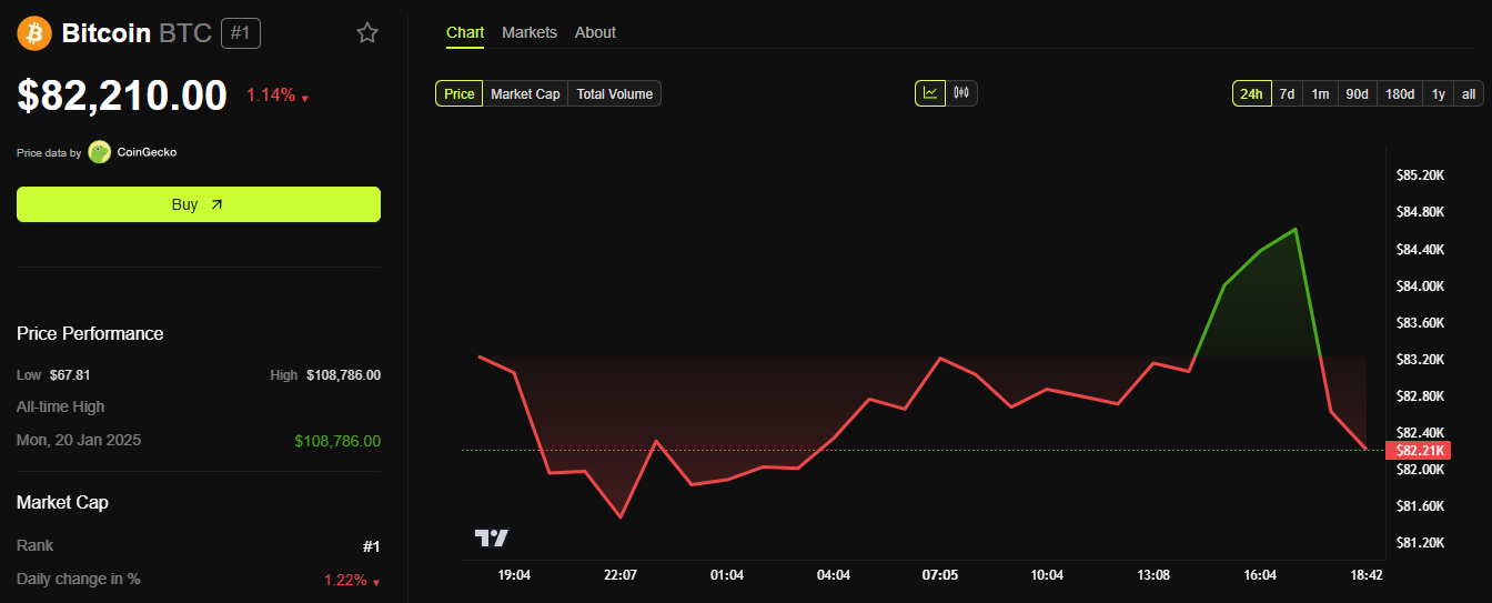 ข่าวจากจีนทำให้นักลงทุนคริปโตวิตกกังวล เมื่อวันที่ 4 เมษายน ราคาบิทคอยน์ลดลงจาก 84,600 USD เป็น 82,000 USD ลดลง 3%