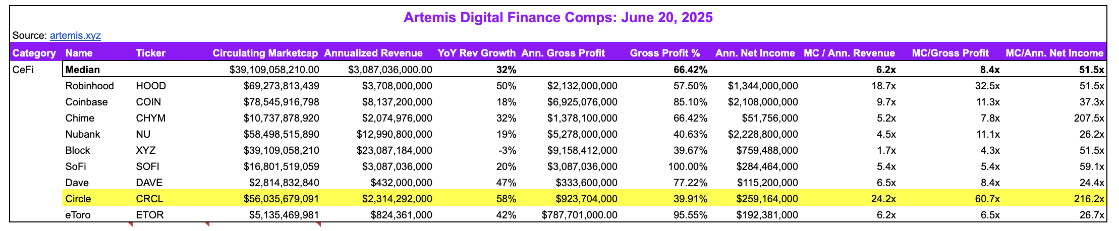 Jon Ma ซีอีโอของบริษัทวิเคราะห์บล็อกเชน Artemis ได้กล่าวว่า Circle กำลังซื้อขายที่มูลค่าหลายเท่าของ Coinbase และ Robinhood แม้ว่าบริษัทเหล่านั้นจะรายงานรายได้สุทธิที่สูงกว่า