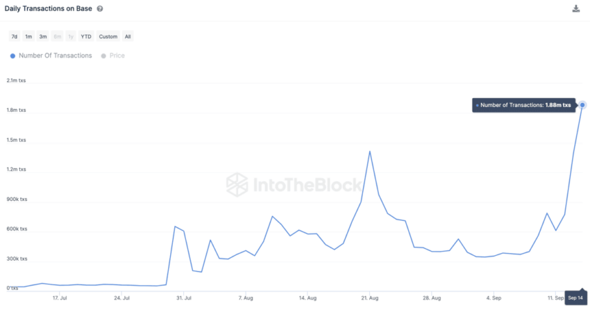Base Network ซึ่งเป็นเครือข่าย Layer-2 ของ Coinbase ยังคงสร้างมาตรฐานใหม่ โดยปริมาณธุรกรรมรายวันแตะระดับสูงสุดเป็นประวัติการณ์เมื่อวันที่ 14 กันยายน 2023