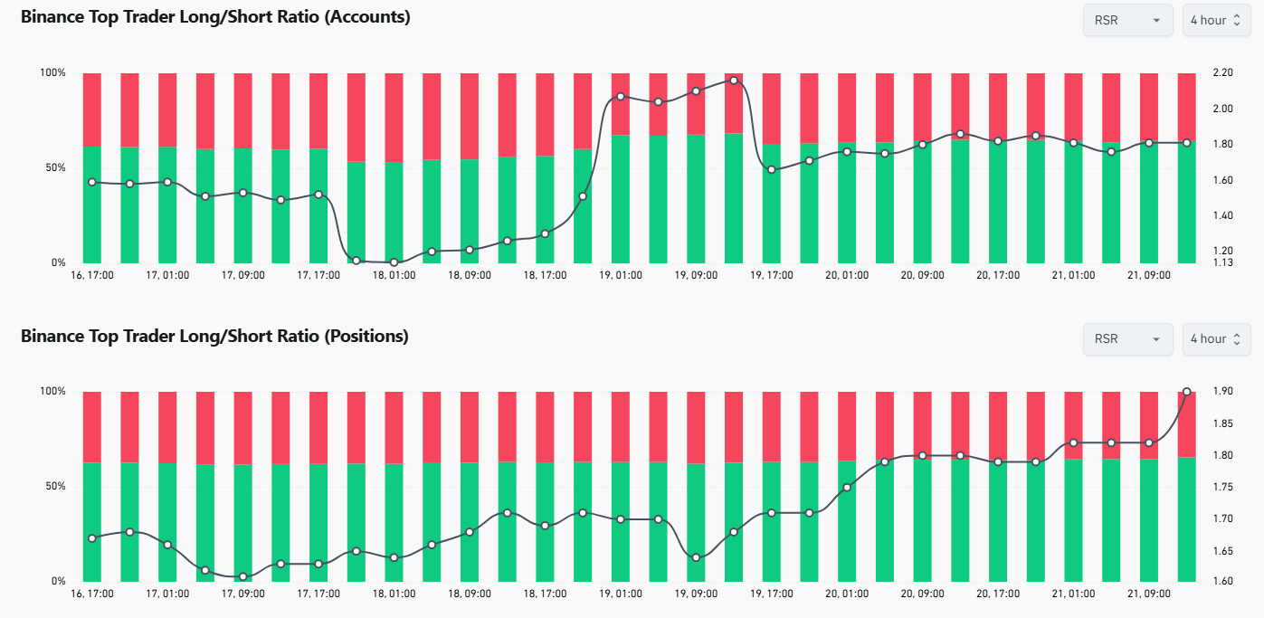 บน Binance อัตราส่วน long/short ของนักเทรดชั้นนำวัดสัดส่วนของตำแหน่งเปิดทั้งหมดที่ถือเป็น long โดย 20% บัญชีที่มีมาร์จิ้นสูงสุด อัตราส่วน long 65.48% หมายความว่าผู้เข้าร่วมที่เรียกว่า “smart money” เหล่านี้กำลังเดิมพันอย่างมากว่าราคาจะเพิ่มขึ้น