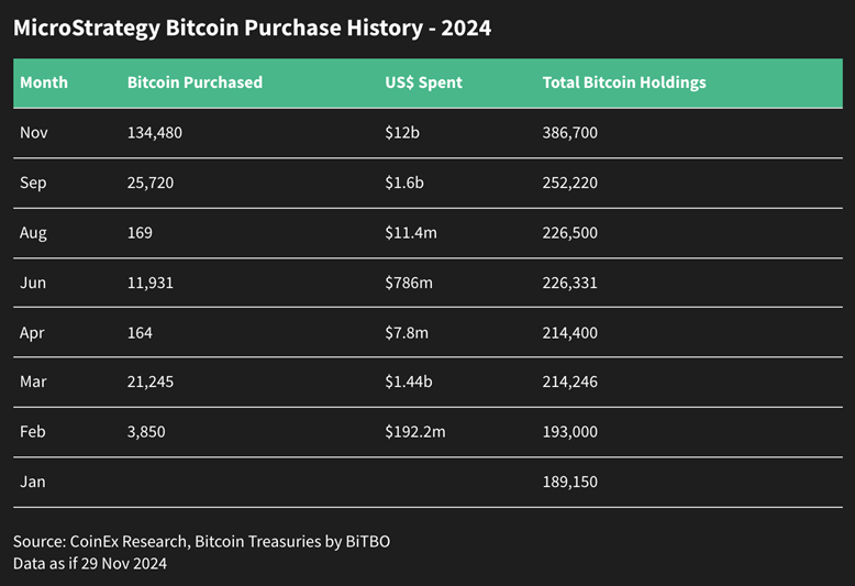 ในเดือนพฤศจิกายนด้วยการสนับสนุนจากสถาบันที่ชัดเจน โดย Bitcoin Spot ETFs มีการไหลเข้าของเงินจำนวน 6.1 พันล้านดอลลาร์ ซึ่งเป็นตัวเลขรายเดือนที่สูงที่สุดจนถึงปัจจุบัน และ MicroStrategy ได้สะสมบิตคอยน์จำนวน 134,480 BTC ซึ่งมีมูลค่าต้นทุนประมาณ 12 พันล้านดอลลาร์ ได้ช่วยเสริมสร้างความโดดเด่นของ MicroStrategy ในตลาดและสนับสนุนให้เกิดแรงผลักดันราคาบิตคอยน์ที่เพิ่มขึ้น