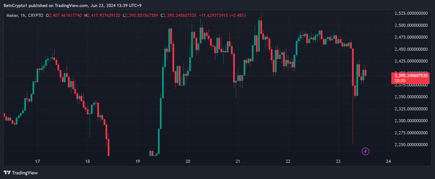 การกระทํานี้ทําให้ ราคาของ MKR ลดลงเกือบ 9% จาก 2,471 ดอลลาร์เป็น 2,250 ดอลลาร์ อย่างไรก็ตาม ในขณะที่เขียน ราคาได้ฟื้นตัวเล็กน้อยและตอนนี้ซื้อขายที่ 2,395 ดอลลาร์