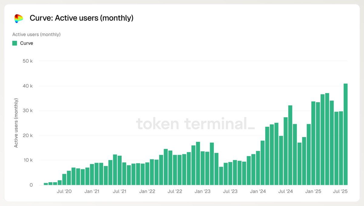 นอกจากนี้ ข้อมูลจาก Filippo ระบุว่า Curve ได้ทำสถิติสูงสุดในจำนวนผู้ใช้งานรายเดือนที่เกิน 40,000 แม้ว่าแพลตฟอร์มจะไม่ได้ใช้ กลยุทธ์การซื้อคืน token เหมือนโครงการอื่น ๆ แต่บางนักวิเคราะห์เชื่อว่า CRV มีประสิทธิภาพดีกว่าการซื้อคืนโดยการดำเนินการที่เพิ่มมูลค่าให้กับผู้ใช้โดยตรง