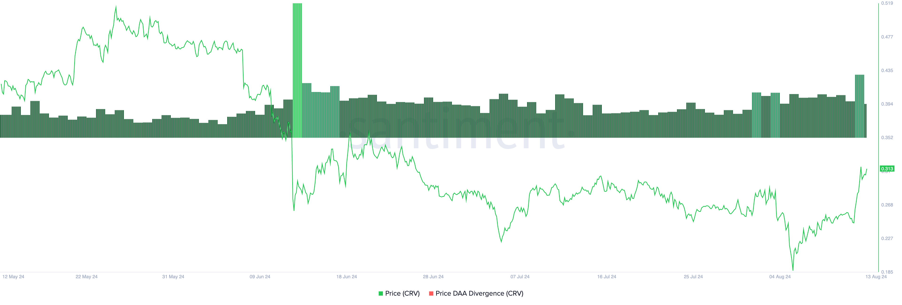 นอกจากนี้ ความแตกต่างของที่อยู่ที่ใช้งานอยู่รายวัน (DAA) ที่เป็นบวกของ CRV ณ เวลาที่สื่อบอกเป็นนัยถึงความเป็นไปได้ของการชุมนุมที่ยั่งยืนเนื่องจากความต้องการ altcoin ยังคงเพิ่มขึ้นอย่างต่อเนื่อง