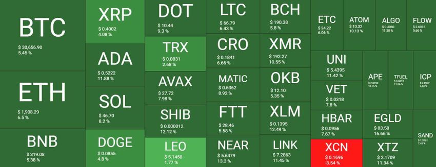 Bitcoin ซื้อขายอยู่ที่ประมาณ 30,700 ดอลลาร์ เพิ่มขึ้น 5.3% ใน 24 ชั่วโมงที่ผ่านมา ดังที่เห็นในแผนภูมิด้านล่าง สิ่งนี้เกิดขึ้นหลังจากแท่งเทียนรายชั่วโมงจำนวนมากขึ้นไปเป็นขาขึ้น