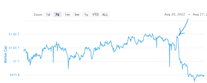 ในช่วงเวลานี้ มูลค่าตลาดรวมของ crypto ทั้งหมดลดลงจาก 1.029 ล้านล้านเป็น 936.87 พันล้านดอลลาร์ ณ จุดหนึ่งในชั่วข้ามคืน คิดเป็นการลดลง 8.95% ตาม CoinMarketCap