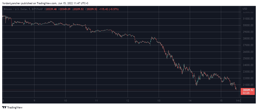 ความผันผวนที่ไร้ทิศทางยังดำเนินอยู่ในตลาด Crypto และยังไม่มีท่าทีของการชะลอตัวเมื่อ Bitcoin ลดลงต่อเนื่องใกล้จะทะลุเส้นต่ำกว่า 20,000 ดอลลาร์ โดยตลาด Crypto สูญเสียกว่า 8 หมื่นล้านในช่วง 24 ชั่วโมงที่ผ่านมา