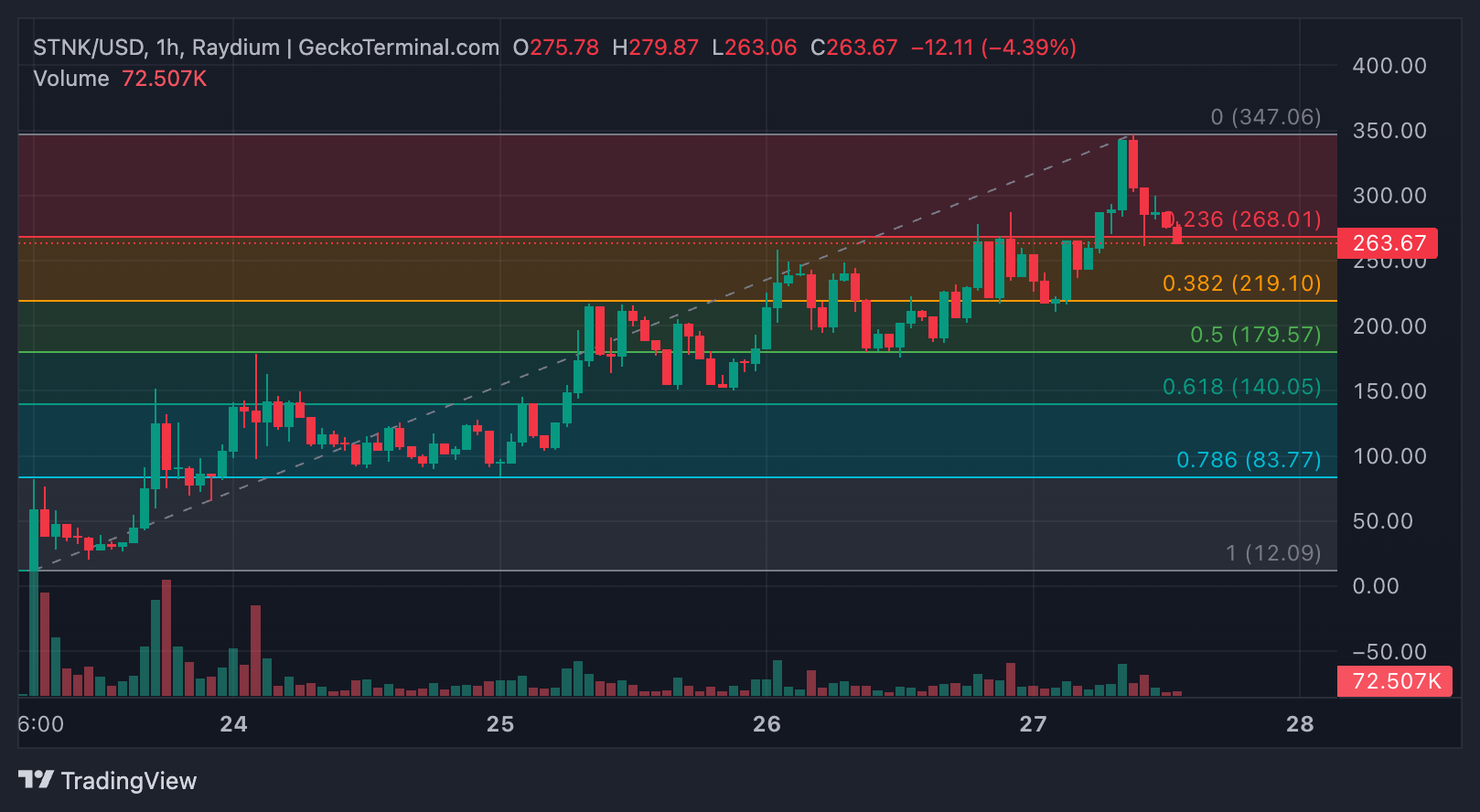การวิเคราะห์โดยใช้เครื่องมือ Fibonacci Retracement บนกราฟรายชั่วโมงแสดงว่า STNK ได้ทะลุแนวรับที่ $268.01 ซึ่งบ่งชี้ถึงการเสริมความแข็งแกร่งของแนวโน้มขาลง หากไม่มีความต้องการใหม่เข้ามาในตลาด ราคาของมันอาจลดลงไปที่ $219.10