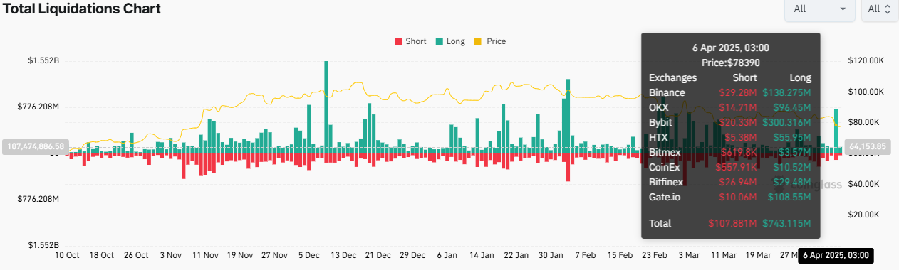 ข้อมูลจาก Coinglass แสดงให้เห็นว่ามีการล้างตำแหน่งมูลค่า 116.59 ล้าน USD ในวันเสาร์ที่ 5 เมษายน ซึ่งประกอบด้วยตำแหน่งสั้น 33.02 ล้าน USD และตำแหน่งยาว 83.57 ล้าน USD