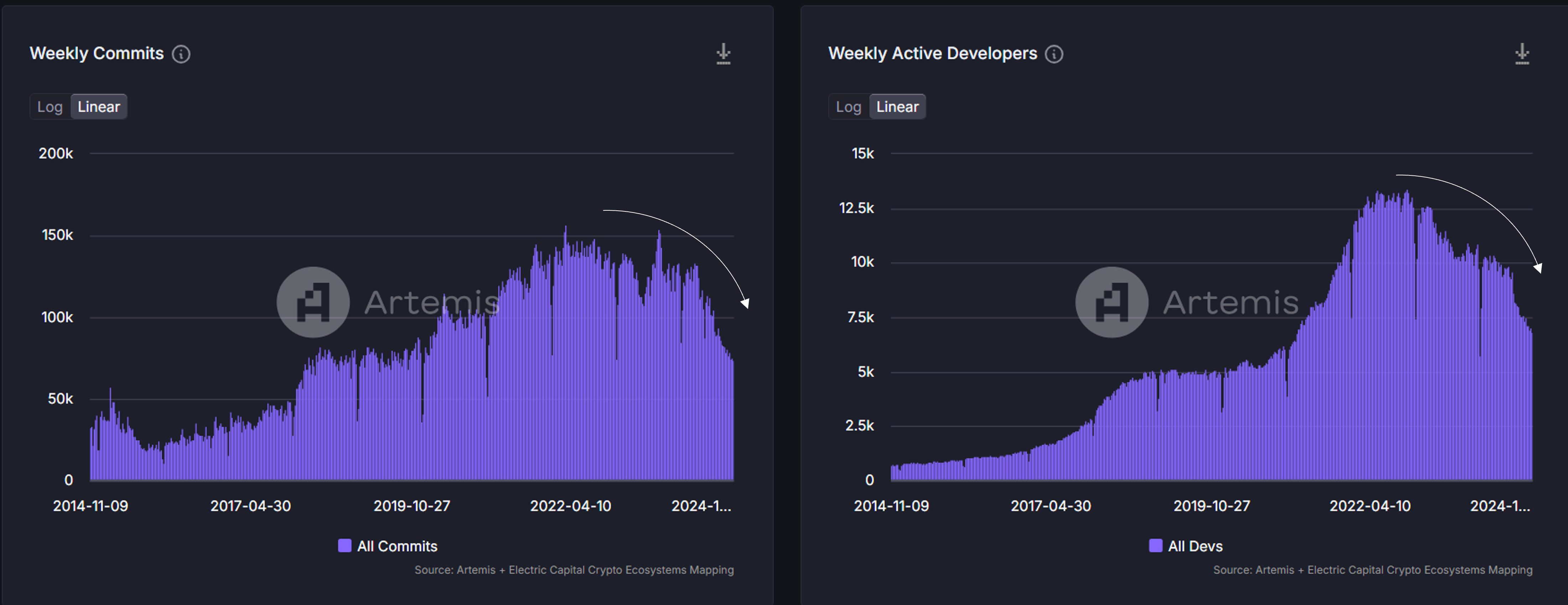 ผลการวิจัยเหล่านี้เกิดขึ้นในบริบทของการลดลงอย่างมากของกิจกรรมนักพัฒนาในตลาดตลอดสองปีที่ผ่านมา ข้อมูลจาก Artemis แสดงให้เห็นว่าจำนวนการคอมมิตรายสัปดาห์ลดลง 50% ในปีที่ผ่านมา