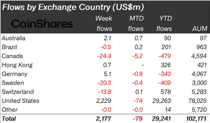 การลงทุนในสินทรัพย์ดิจิทัลพุ่งสูงถึง 2.17 พันล้าน USD ในสัปดาห์ที่แล้ว ทำให้ยอดรวมตั้งแต่ต้นปีเพิ่มขึ้นเป็น 29.2 พันล้าน USD การไหลเข้าของเงินทุนครั้งนี้ได้ยกระดับสินทรัพย์ที่อยู่ภายใต้การจัดการ (AUM) ในสินทรัพย์ดิจิทัลเกิน 100 พันล้าน USD ซึ่งเป็นระดับที่เคยบรรลุได้เพียงในเดือนมิถุนายน 2024 เท่านั้น