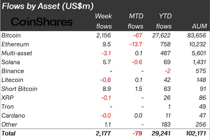 Bitcoin ครองการไหลเข้าในสัปดาห์ที่แล้วด้วยเงินลงทุน 2.15 พันล้าน USD สะท้อนถึงความมั่นใจของนักลงทุน นอกจากนี้ยังมีเงินไหลเข้าเล็กน้อย 8.9 ล้าน USD สู่ผลิตภัณฑ์ที่เดิมพันต่ำกว่า Bitcoin ซึ่งบ่งบอกถึงการป้องกันความเสี่ยงของนักลงทุนท่ามกลางการเคลื่อนไหวของราคา Bitcoin ที่แข็งแกร่ง