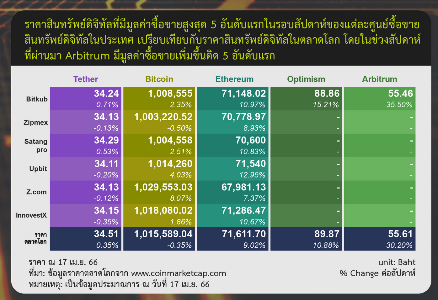 ราคา Bitcoin ในตลาดโลก คิดแล้วอยู่ที่โทเค็นละ 1,015,589.04 บาท ตามมาด้วย Ethereum ที่โทเค็นละ 71,611.70 บาท ทั้งนี้ Arbitrum มีมูลค่าซื้อค่าติด 1 ใน 5 ที่มูลค่า 55.61 ต่อโทเค็น
