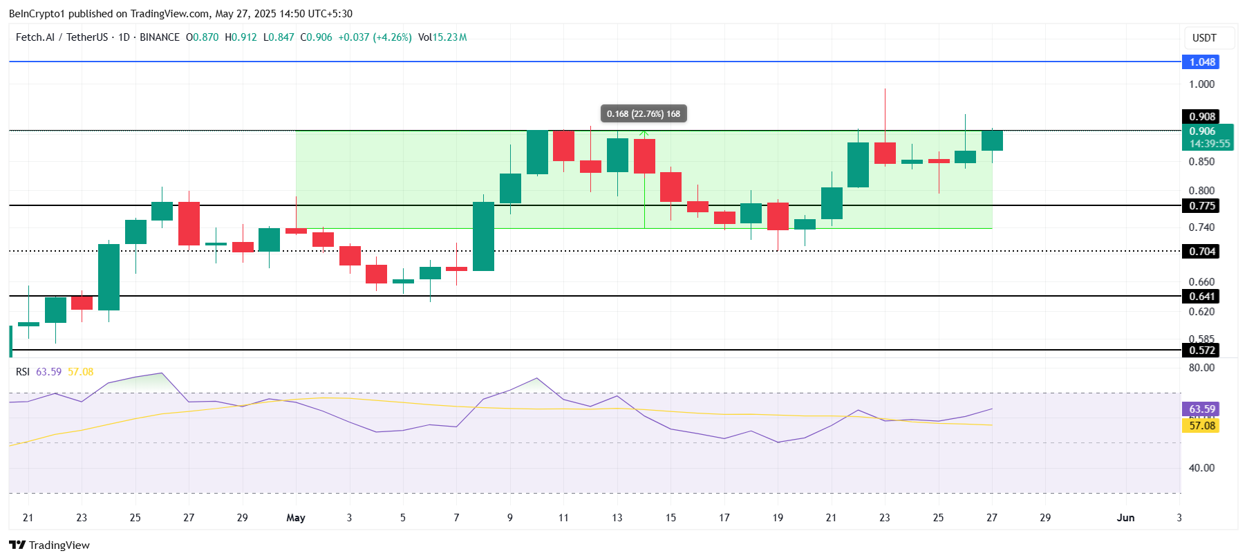 FET ได้เพิ่มขึ้น 22% ในเดือนนี้ ปัจจุบันซื้อขายอยู่ที่ 0.906 USD การเติบโตที่แข็งแกร่งนี้บ่งชี้ว่าการตอบสนองใน 24 ชั่วโมงข้างหน้าอาจดันราคาให้สูงกว่า 1.000 USD ซึ่งแสดงถึงความมั่นใจและแรงผลักดันใหม่ของนักลงทุนสำหรับ altcoin นี้