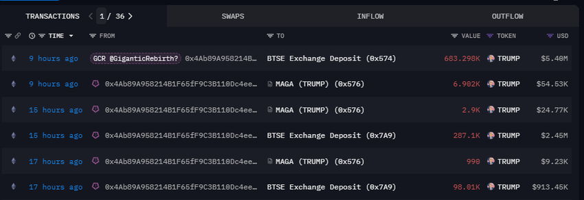แพลตฟอร์มการติดตามบนเครือข่าย Lookonchain เพิ่งรายงานว่า กระเป๋าเงินที่สงสัยว่าเป็นของผู้ค้าคริปโตชื่อดัง Gigantic-Cassocked-Rebirth (GCR) ได้ฝาก เหรียญมีม MAGA (TRUMP) จํานวน 1.08 ล้านเหรียญลงใน BTSE Exchange ข้อมูลบนเครือข่ายเผยให้เห็นว่าการถ่ายโอนเริ่มต้นเมื่อประมาณสิบเจ็ดชั่วโมงที่แล้ว โทเค็นเหล่านี้มีมูลค่าประมาณ 8.85 ล้านดอลลาร์