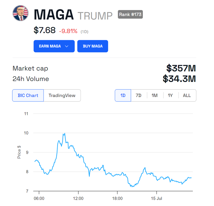 อย่างไรก็ตามในขณะที่เขียนราคาของทรัมป์มีเสถียรภาพ ข้อมูล BeInCrypto แสดงให้เห็นว่าปัจจุบันซื้อขายที่ $7.68 ลดลง 9.81% ใน 24 ชั่วโมงที่ผ่านมา