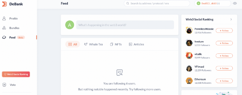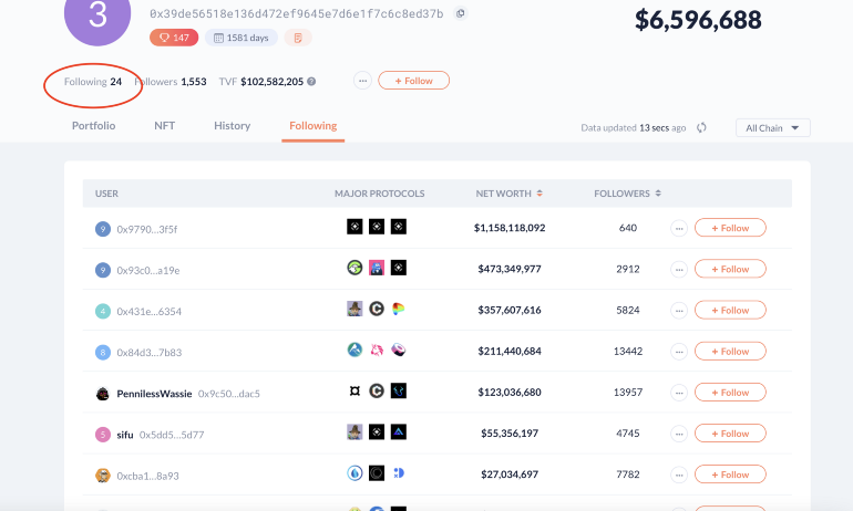 คุณจะเห็นรายชื่อวาฬที่มีผู้ติดตามมากที่สุดใน DeBank จากนี้ไปทุกอย่างจะต้องดำเนินการด้วยตนเอง ตรวจสอบทีละรายการและค้นหากระเป๋าสตางค์ที่คุณชอบหรือสนใจ ลึกซึ้ง และสร้างแรงบันดาลใจ ค้นหาสไตล์ที่คุณเชื่อมโยงได้