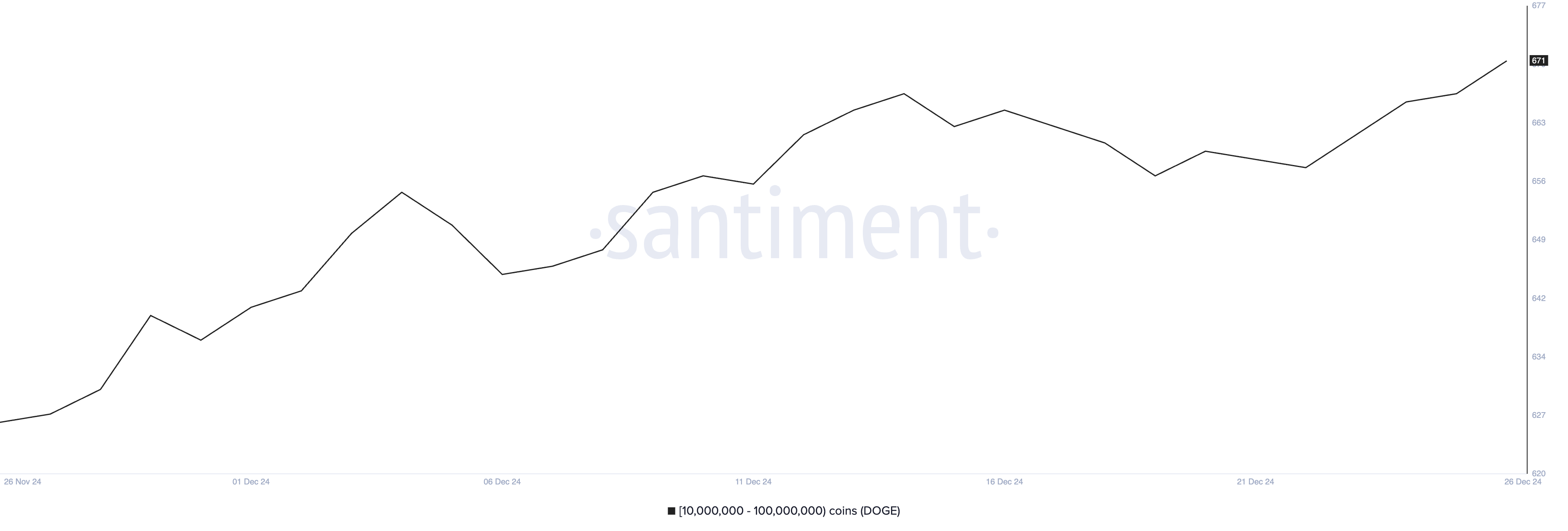 จำนวนที่อยู่ที่ถือระหว่าง 10 ล้านถึง 100 ล้าน DOGE เพิ่มขึ้นจาก 660 ในวันที่ 20 ธันวาคม เป็น 671 ในวันที่ 26 ธันวาคม สะท้อนถึงแนวโน้มการสะสมของวาฬที่ต่อเนื่อง การเติบโตนี้สอดคล้องกับการเพิ่มขึ้น 5% ของ ราคา DOGE ในช่วงเจ็ดวันที่ผ่านมา ทำให้มูลค่าตลาดใกล้เคียงกับ 47 พันล้าน USD