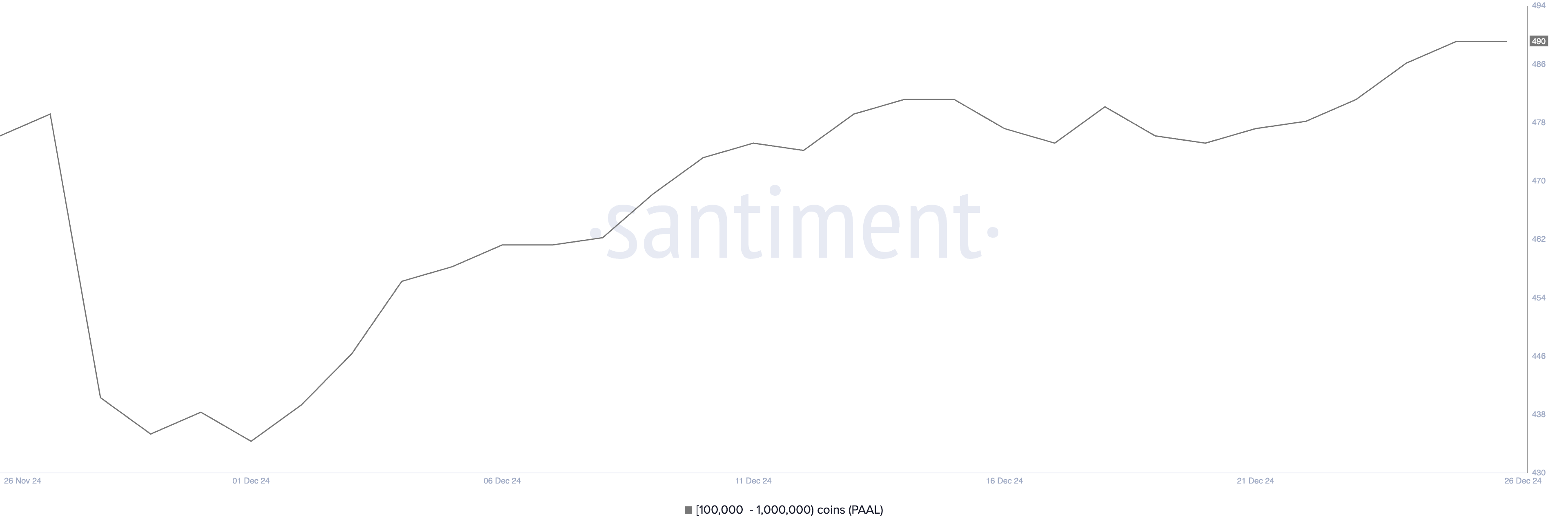 วาฬได้ซื้อ PAAL AI ซึ่งเพิ่มขึ้น 94% ในช่วง 30 วันที่ผ่านมา โดยได้รับประโยชน์จากความสนใจที่เพิ่มขึ้นในโครงการที่เชื่อมโยงระหว่างคริปโตและ ปัญญาประดิษฐ์ จำนวนกระเป๋าที่ถือระหว่าง 100,000 ถึง 1,000,000 PAAL ได้เพิ่มขึ้นจาก 477 ในวันที่ 19 ธันวาคม เป็น 490 โดยตัวเลขนี้คงที่ในช่วงสองวันที่ผ่านมา