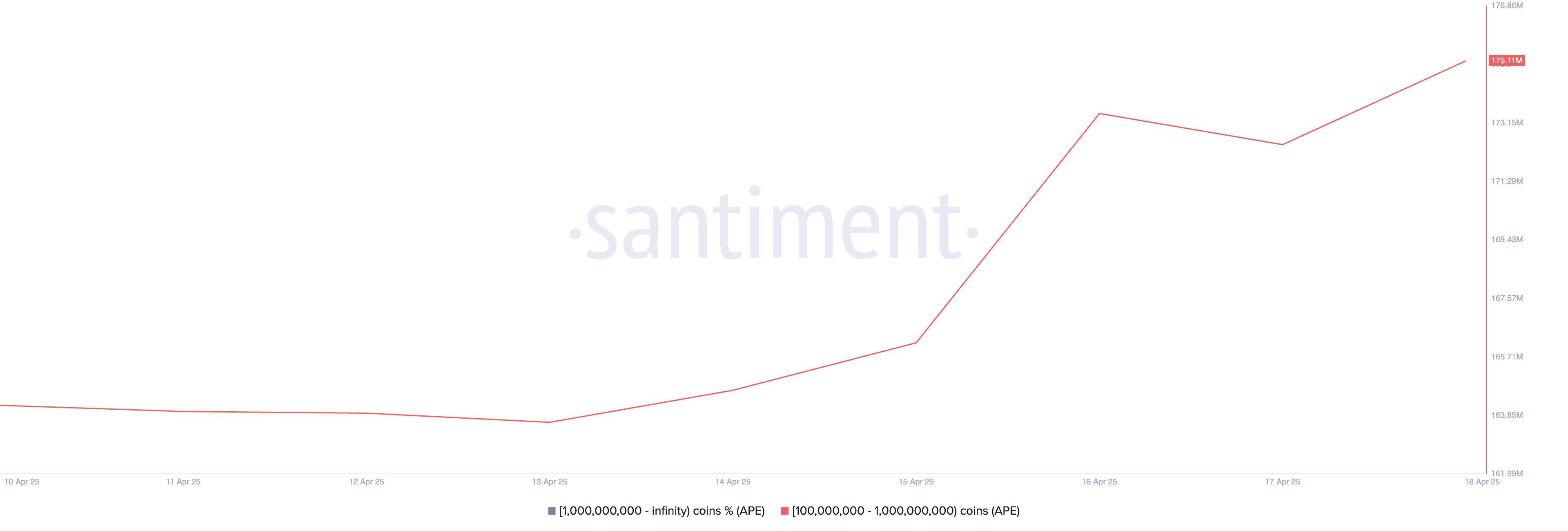 ตามข้อมูลจาก Santiment ที่อยู่ของวาฬขนาดใหญ่ที่ถือ APE ระหว่าง 100 ล้านถึง 1 พันล้าน ได้สะสมโทเค็นจำนวน 11 ล้านโทเค็นในสัปดาห์ที่ผ่านมานี้