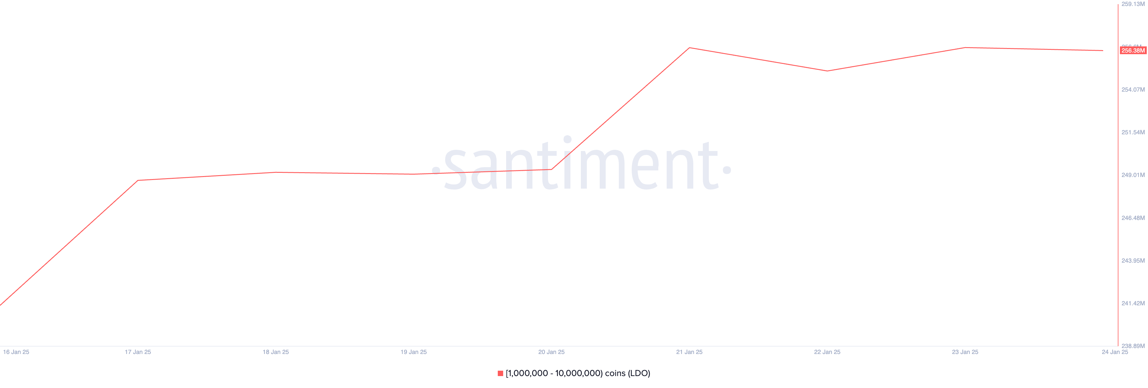Lido DAO’s LDO ยังมีการเคลื่อนไหวของวาฬเพิ่มขึ้นในสัปดาห์นี้ ข้อมูลบนบล็อกเชนแสดงให้เห็นว่านักลงทุนรายใหญ่ที่ถือระหว่าง 1 ล้านถึง 10 ล้านโทเค็นได้สะสม LDO จำนวน 15 ล้านโทเค็น มูลค่ามากกว่า 31 ล้าน USD ในสัปดาห์นี้