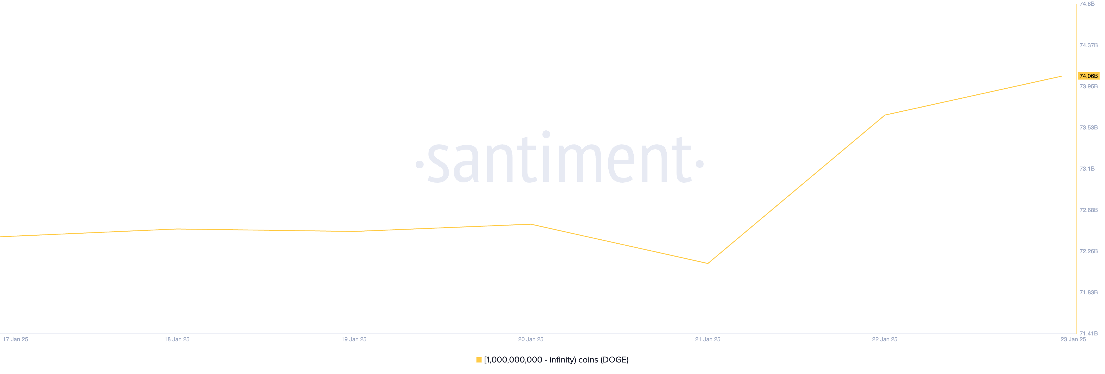 การวิเคราะห์การกระจายอุปทานของ Dogecoin แสดงให้เห็นว่าที่อยู่ของวาฬที่ถือครองมากกว่า 1 พันล้าน DOGE ได้สะสม coin จำนวนมากถึง 1.65 พันล้าน coin ในสัปดาห์นี้ ซึ่งมีมูลค่ามากกว่า USD569 ล้าน ทำให้การถือครองทั้งหมดของกลุ่มนี้เพิ่มขึ้นเป็น 74.06 พันล้าน DOGE