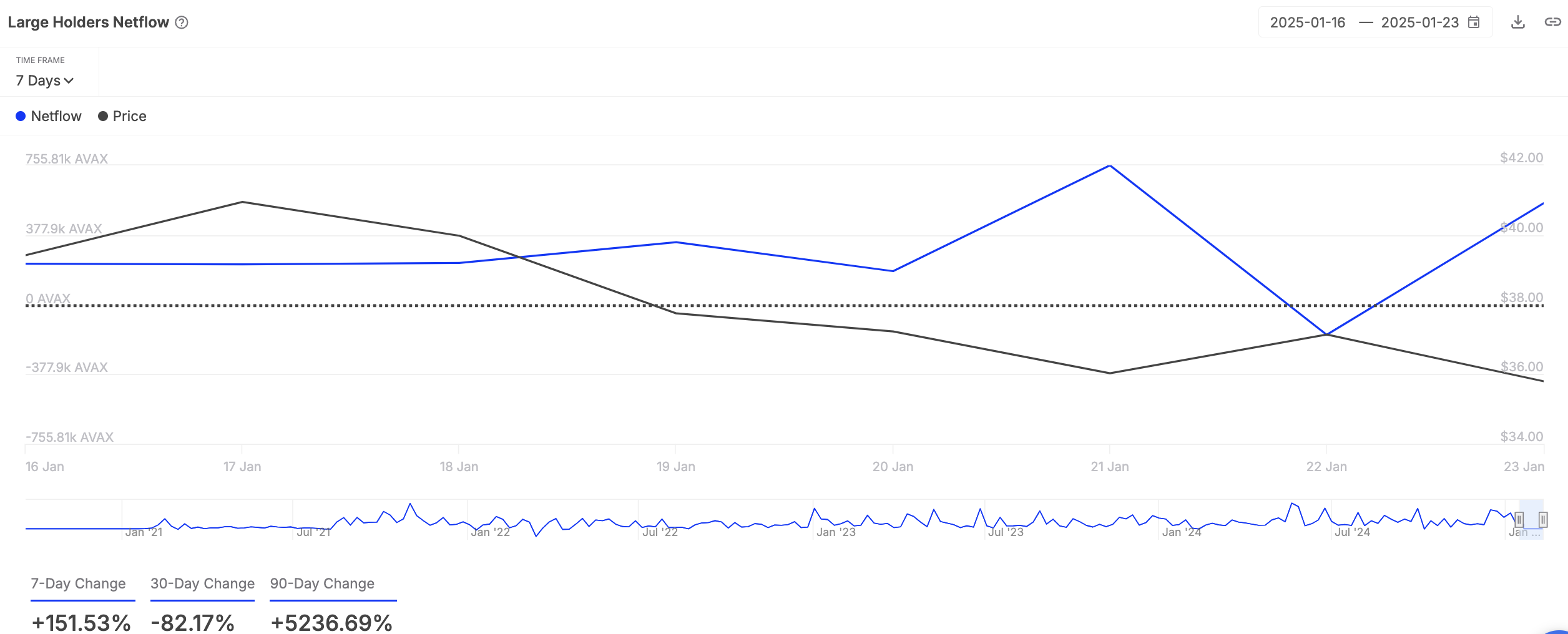 coin ชั้นหนึ่ง AVAX เป็นหนึ่งในตัวเลือกยอดนิยมของวาฬคริปโตในสัปดาห์นี้ ซึ่งเห็นได้จากการเพิ่มขึ้นสามหลักใน netflow ของผู้ถือรายใหญ่ในช่วงเจ็ดวันที่ผ่านมา ซึ่งเพิ่มขึ้น 151% ตามข้อมูลจาก IntoTheBlock