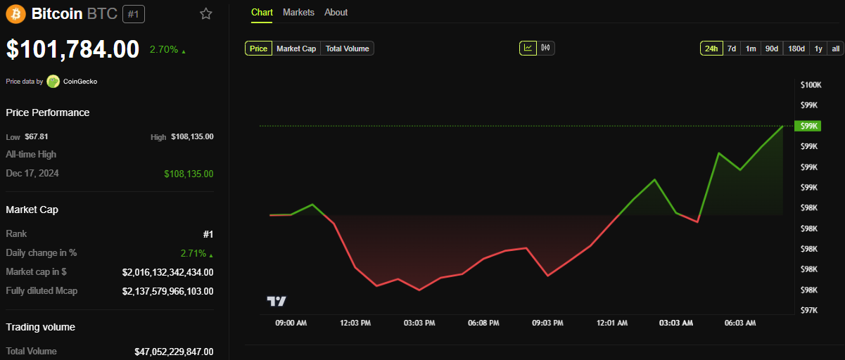 ข้อมูลจาก BeInCrypto แสดง ว่า BTC ซื้อขายอยู่ที่ USD 101,784 ณ ขณะที่เขียนบทความนี้ ซึ่งแสดงถึง การเพิ่มขึ้น เกือบ 3% ตั้งแต่เปิดการซื้อขายในวันอังคาร