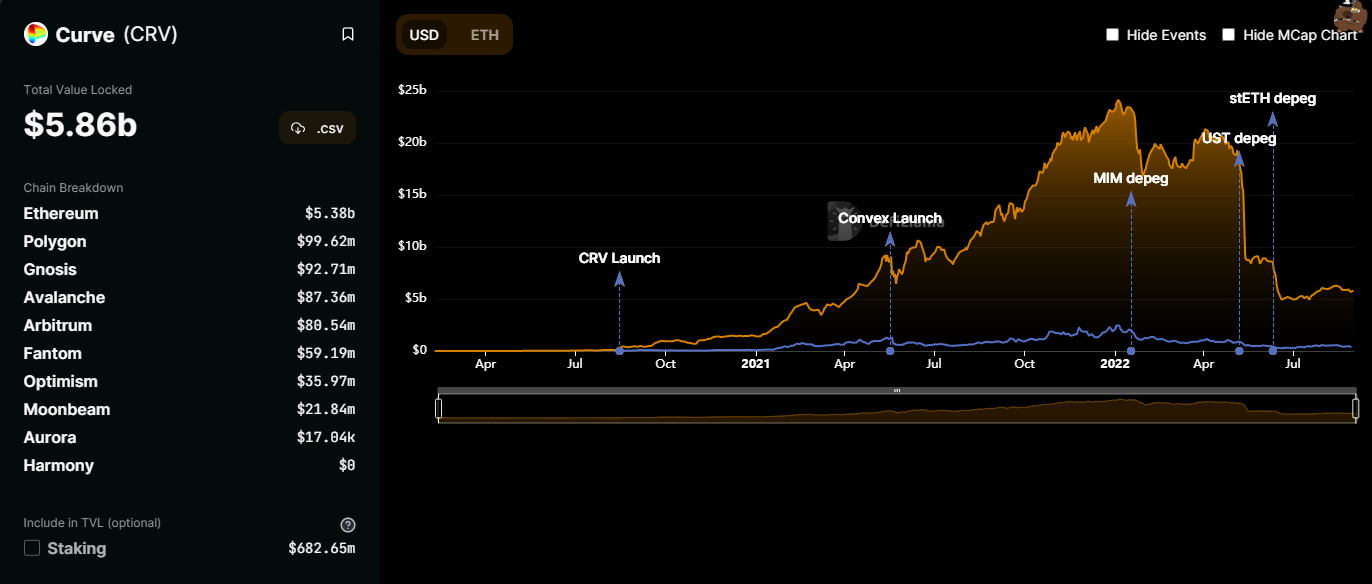 อย่างไรก็ตาม TVL นี้ลดลงจากระดับสูงสุดที่ 24.3 พันล้านดอลลาร์ในเดือนมกราคม สืบเนื่องจากเหตุการณ์ depegging ของ MIM, UST และ stETH หรือการที่สินทรัพย์เหล่านี้สูญเสียการตรึงมูลค่า 1: 1 เป็น USD หรือ ETH