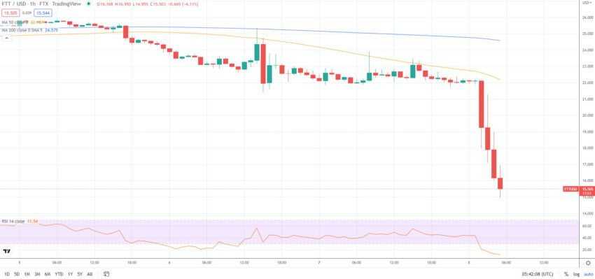 ณ ขณะที่เขียนบทความ ราคา FTT ลดลงมาแล้ว 32% ภายในไม่กี่ชั่วโมงมาอยู่ที่ 15 ดอลลาร์สหรัฐ ตามข้อมูลของ TradingView เท่ากับว่าราคาของโทเค็นลดลงมา 81% จากราคาสูงสุดตลอดกาลในเดือนกันยายน 2021 ซึ่งสูงกว่า 84 ดอลลาร์สหรัฐ