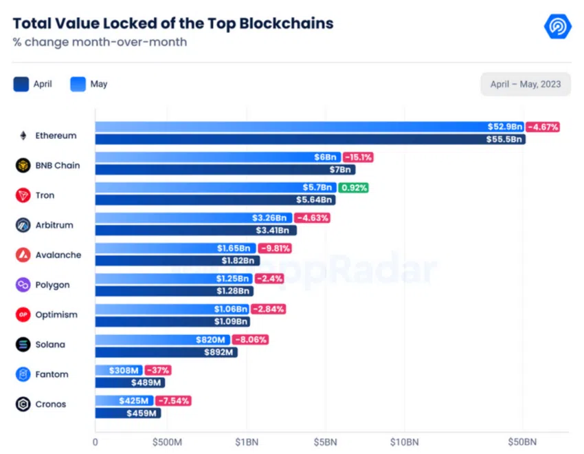 นอกจากนี้ อุตสาหกรรม dApp เติบโตขึ้น ในขณะที่บล็อกเชนต่าง ๆ ยกเว้น Tron กลับลดลงใน TVL