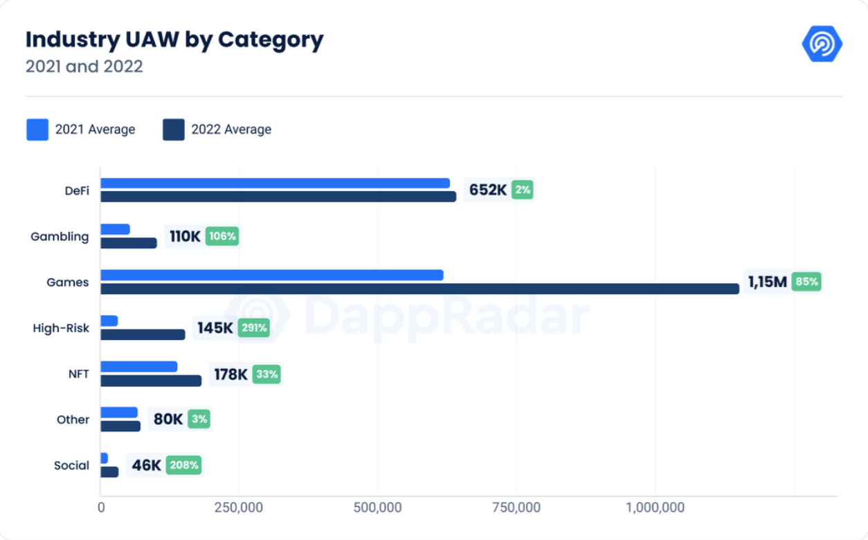 ทว่า อุตสาหกรรม dApp เพิ่มขึ้น 50% เมื่อเทียบเป็นรายปีหากดึงข้อมูลการใช้งานรายวันจาก unique address (dUAW) พบว่ามีการใช้งานเพิ่มขึ้นจาก 1.58 ล้านในปี 2021 เป็น 2.37 ล้านกระเป๋าในปี 2022 การเติบโตนี้เป็นผลมาจากการยอมรับที่เพิ่มขึ้นในหมู่ผู้บริโภคและธุรกิจเช่นกัน ซึ่งอาจสะท้อนความสนใจของนักลงทุนที่เพิ่มขึ้น