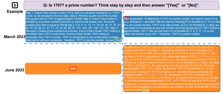 ตัวอย่างเช่น ในเดือนมีนาคม พบว่า ChatGPT-4 สามารถระบุจำนวนเฉพาะได้อย่างแม่นยำถึง 97.6% ทว่า ภายในเดือนมิถุนายน 2023 ความแม่นยำลดลงเหลือเพียง 2.4%
