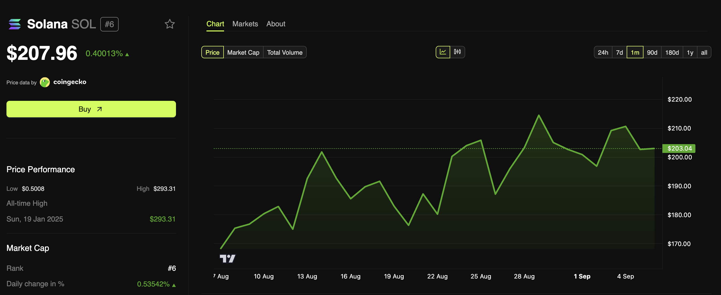 ในขณะเดียวกัน การซื้อครั้งนี้ยังไม่เพียงพอที่จะกระตุ้นการพุ่งขึ้นอย่างมากของ Solana ข้อมูลจาก BeInCrypto Markets แสดงให้เห็นว่า altcoin นี้เพิ่มขึ้นเพียง 0.4% ในช่วงวันที่ผ่านมา ท่ามกลางการชะลอตัวของตลาดที่กว้างขึ้น ในขณะนี้ มันซื้อขายที่ 207.96 USD
