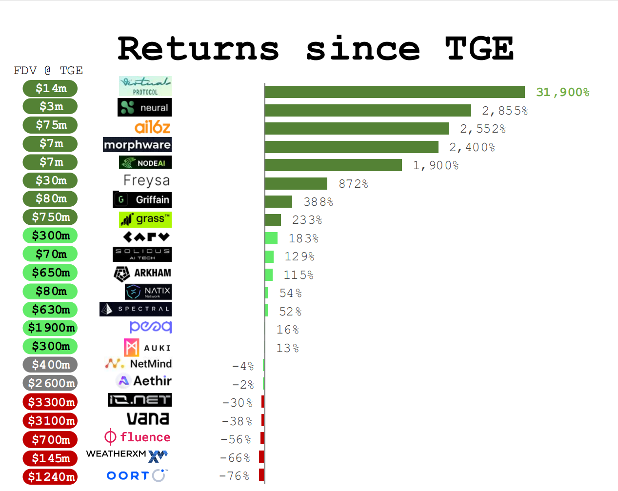 ในบรรดาโทเค็น DePIN ชั้นนำ 22 รายการ มีเพียงสี่รายการที่สูญเสียมูลค่าตั้งแต่เหตุการณ์การสร้างโทเค็น (TGE) Virtuals Protocol มีการเติบโตที่ยอดเยี่ยม โดยเพิ่มขึ้นกว่า 30,000% ตั้งแต่ TGE โครงการอื่นๆ เช่น NEURAL และ NodeAI ก็เติบโตมากกว่า 2,000%