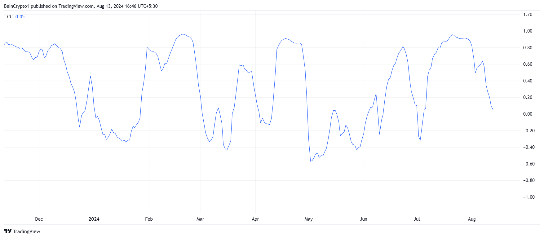 ตั้งแต่ต้นเดือนสิงหาคม ความสัมพันธ์ของ HNT กับ Bitcoin ได้แย่ลง โดยปัจจุบันอยู่ที่ 0.05 ความสัมพันธ์ที่อ่อนแอลงนี้มีความโดดเด่นเนื่องจาก Bitcoin ประสบกับสภาวะขาลงในช่วงไม่กี่วันที่ผ่านมา