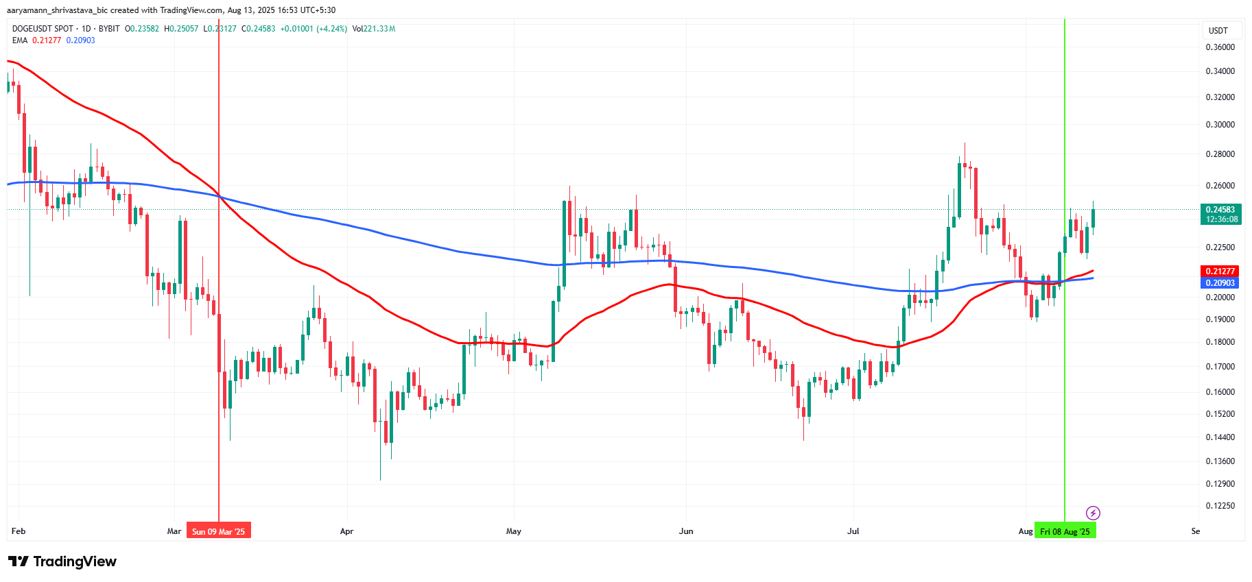 ในขณะที่เขียนบทความนี้ Dogecoin กำลังซื้อขาย ที่ USD0.246 โดยเพิ่งทะลุระดับแนวต้านที่ USD0.241 เพื่อรักษาการเคลื่อนไหวขึ้น Dogecoin จำเป็นต้องเปลี่ยนระดับนี้เป็นแนวรับที่แข็งแกร่ง หากสามารถยืนเหนือ USD0.241 ได้ มีแนวโน้มว่าจะขึ้นต่อไป โดยมี USD0.273 เป็นแนวต้านหลักถัดไป