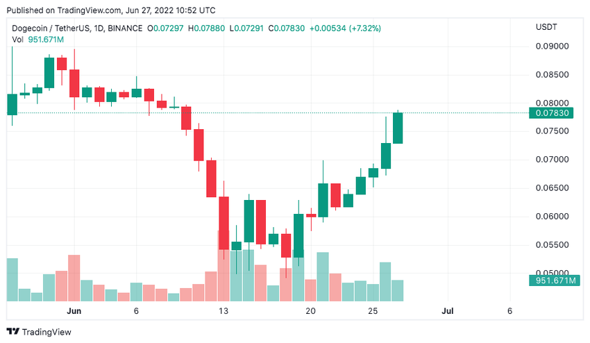 Dogecoin พุ่งขึ้น 10% กลายเป็นหนึ่งในเหรียญได้กำไรมากที่สุดของตลาด Crypto ในวันจันทร์ หลังมีการซื้อขายเพิ่มขึ้นในวันอาทิตย์