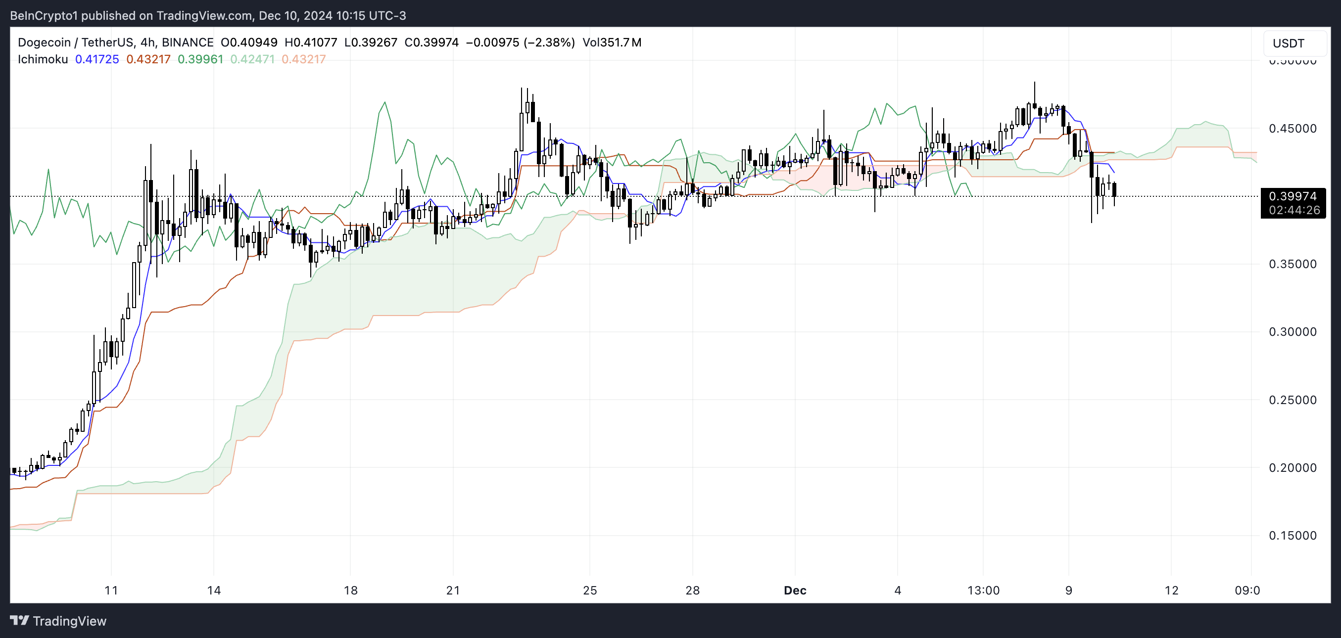 Dogecoin แผนภูมิ Ichimoku แสดงให้เห็นว่าการเคลื่อนไหวของราคาเพิ่งเข้าสู่ช่วงขาลง โดยแท่งเทียนลดลงต่ำกว่าก้อนเมฆหลังจากช่วงเวลาที่ยาวนานที่ ราคา DOGE เคลื่อนที่อยู่เหนือและภายในมัน