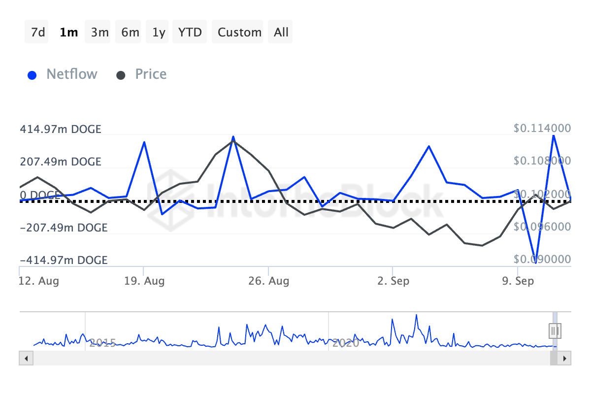 นอกจากนี้ การไหลเข้าและออกของเงินของผู้ถือ DOGE จำนวนมาก ได้ลดลงมากกว่า 112% ในเดือนที่ผ่านมา ซึ่งบ่งชี้ถึงปริมาณการกระจาย coin สูงในหมู่นักลงทุนที่ถืออย่างน้อย 0.1% ของ coin ที่หมุนเวียนในตลาด