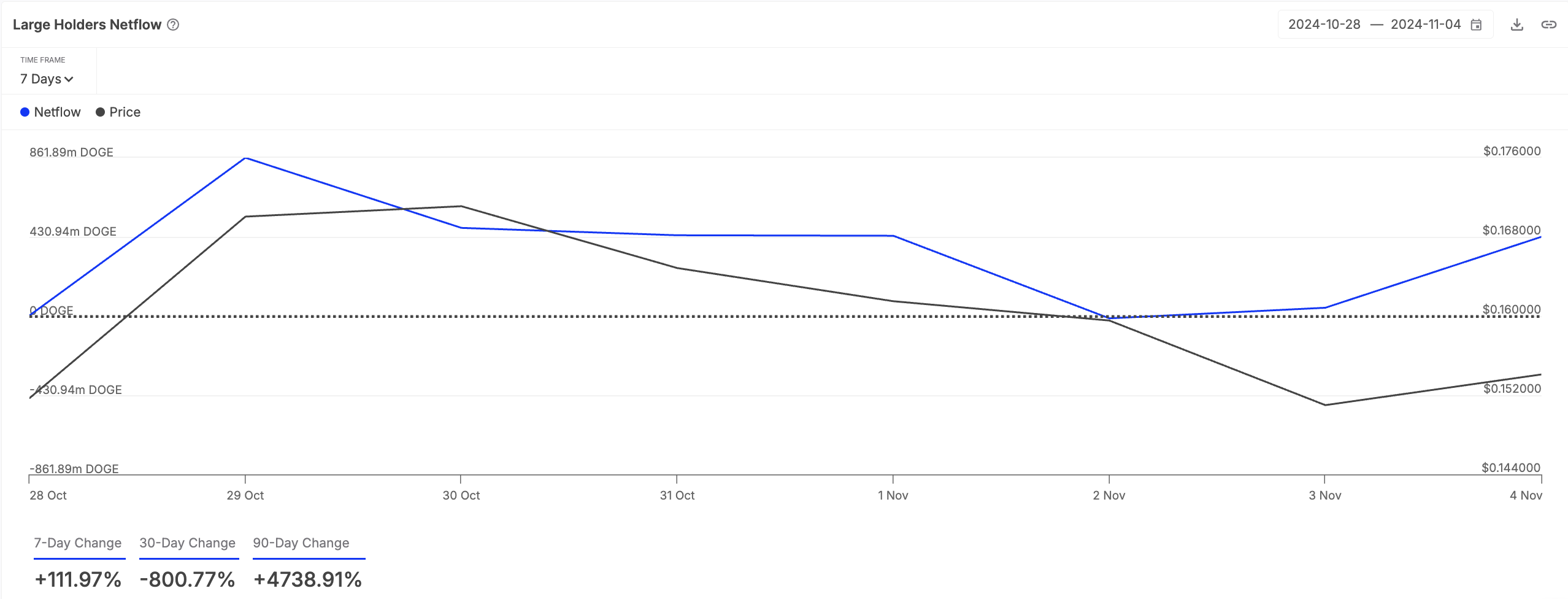 ตามข้อมูลจาก IntoTheBlock DOGE ได้บันทึกการเพิ่มขึ้น 112% ในการไหลสุทธิของผู้ถือรายใหญ่ในช่วงเจ็ดวันที่ผ่านมา