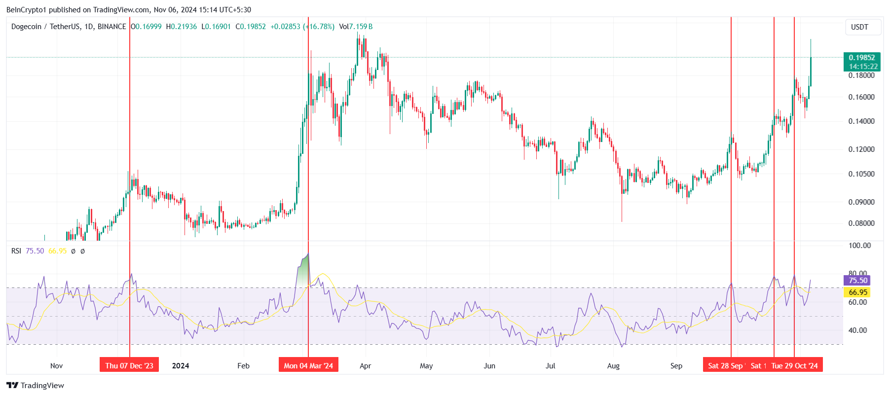 Sponsoredเมื่อ RSI ข้ามเกณฑ์นี้ มักบ่งชี้ว่าแรงผลักดันขาขึ้นของสินทรัพย์ได้ถึงจุดสูงสุด ซึ่งอาจนำไปสู่การถอยกลับ นี่เป็นสิ่งที่เกี่ยวข้องโดยตรงกับ Dogecoin ซึ่งประวัติศาสตร์แสดงให้เห็นถึงการแก้ไขระยะสั้นทุกครั้งที่มันเข้าสู่ช่วงที่ซื้อมากเกินไป