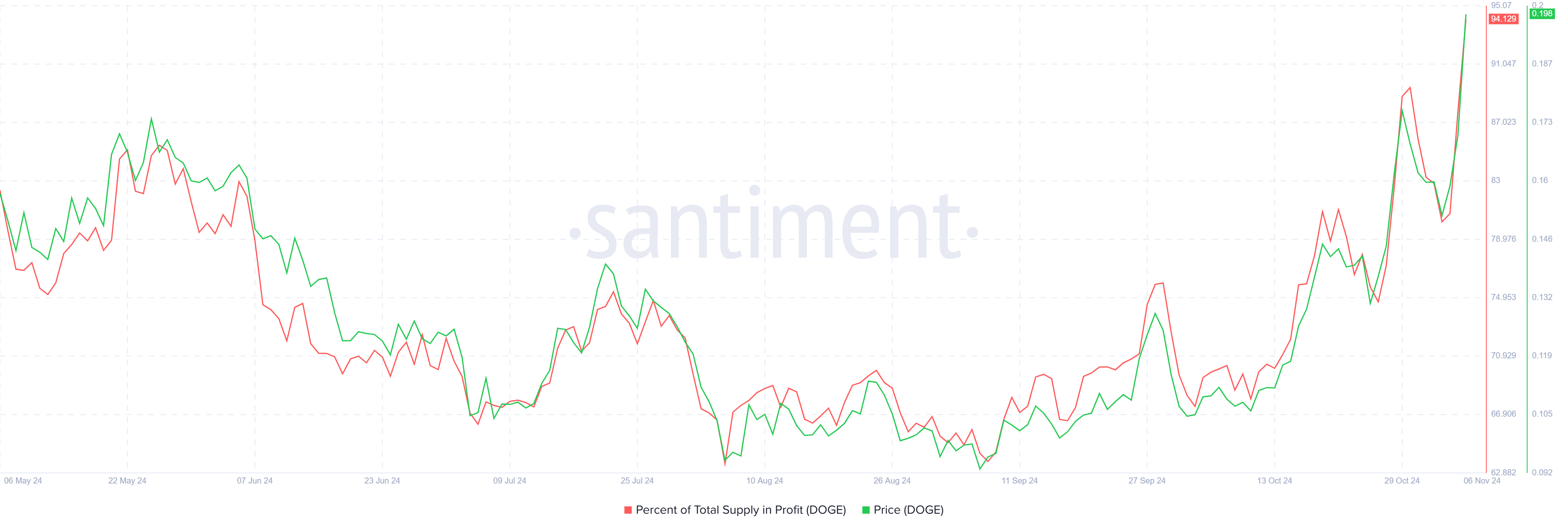 ความรู้สึกตลาดของ Dogecoin เปิดเผยว่า 94% ของปริมาณทั้งหมดที่มีอยู่ขณะนี้อยู่ในสถานะกำไร ซึ่งเป็นสัญญาณว่าสินทรัพย์นี้กำลังใกล้จุดสูงสุดของตลาด