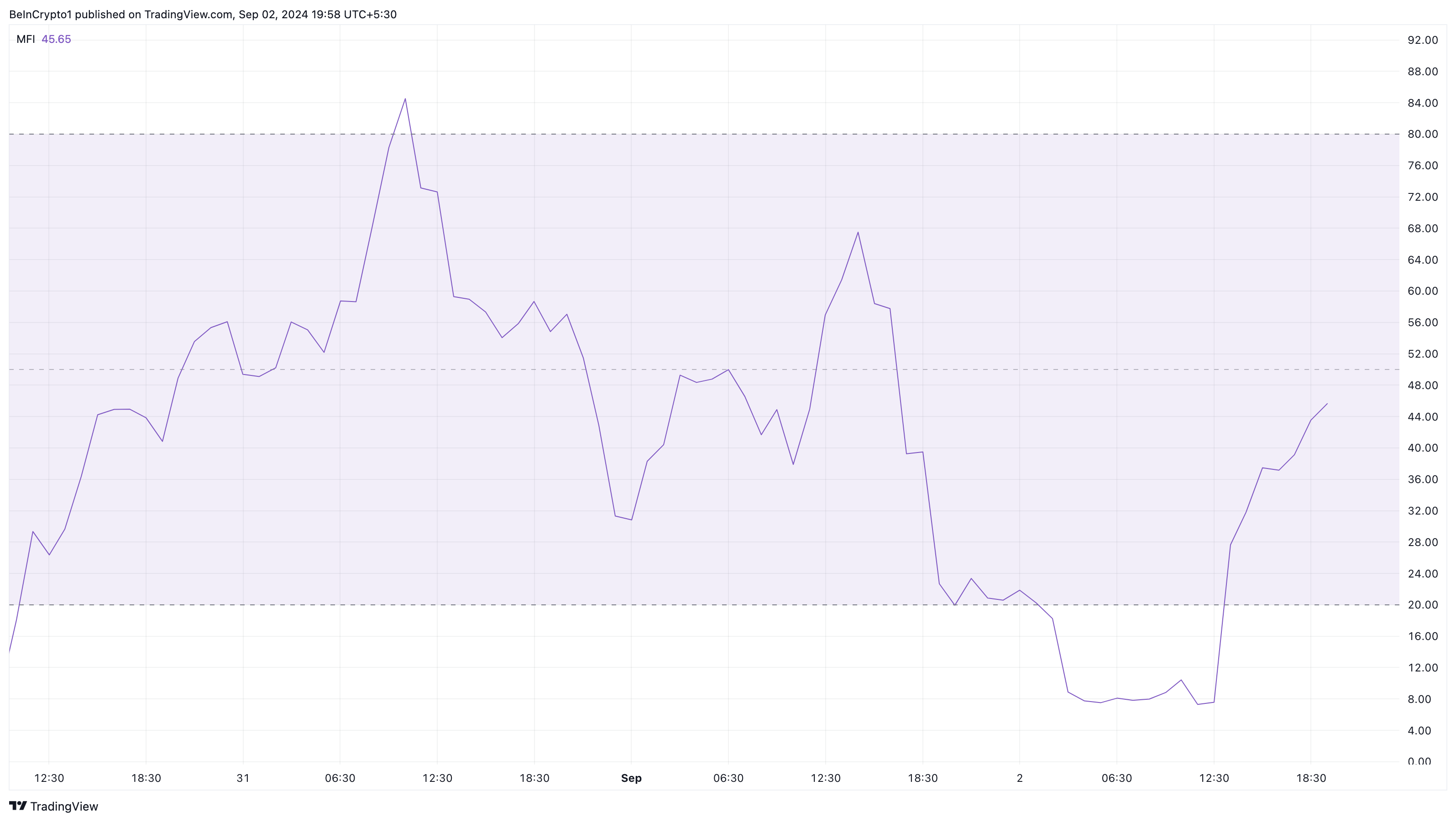 MFI เป็นตัวบ่งชี้ทางเทคนิคที่แสดงระดับการไหลเข้าของเงินทุนเข้าสู่สกุลเงินดิจิทัล หากลดลง หมายถึงแรงขายเพิ่มขึ้น ในทางกลับกัน หากเพิ่มขึ้น แสดงถึงสถานการณ์ที่ตรงกันข้าม.