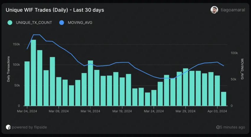 จากจุดต่ำสุดในรอบ 30 วันในวันที่ 23 มีนาคม จำนวนการซื้อขายรายวันที่ไม่ซ้ำกันของ WIF ได้ก้าวกระโดดอย่างมีนัยสำคัญเป็น 74,500 ราย ภายในวันที่ 3 เมษายน ซึ่งเพิ่มขึ้นถึง 127.83% แม้ว่าการฟื้นตัวครั้งนี้จะเป็นเรื่องที่น่าประทับใจ แต่สิ่งสำคัญที่ควรทราบก็คือตัวเลขเหล่านี้ยังคงต่ำกว่าจุดสูงสุดที่ 161,000 รายในวันที่ 5 มีนาคม ซึ่งบ่งชี้ว่ายังมีช่องว่างสำหรับการเติบโตที่เพิ่มมากขึ้นได้