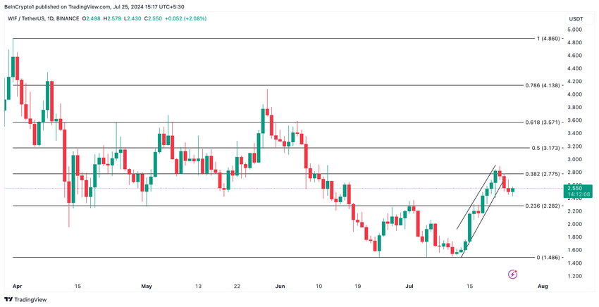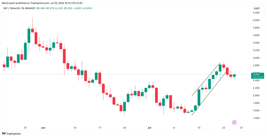 การประเมินการเคลื่อนไหวของราคาของ WIF ในกราฟรายวันเผยให้เห็นว่ามีการซื้อขายภายในช่องทางจากน้อยไปมากระหว่างวันที่ 14 ถึง 23 กรกฎาคม ในช่วงเวลานั้น ราคาของเหรียญมีมเพิ่มขึ้น 83%