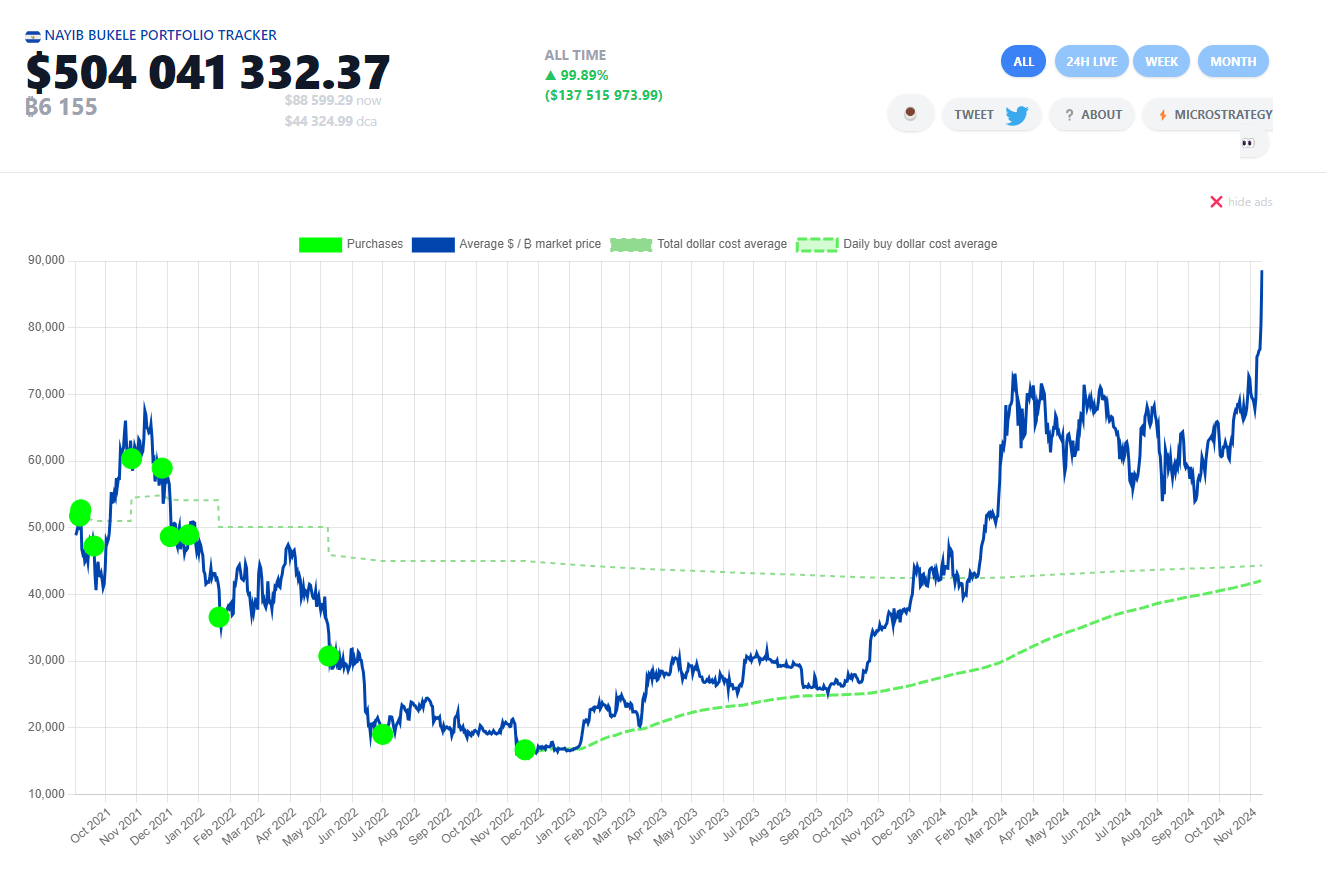 Bukele ได้รับความสนใจระดับโลกในปี 2021 เมื่อ El Salvador กลายเป็นประเทศแรก ที่รับรอง Bitcoin เป็นสกุลเงินทางกฎหมาย ทรัพย์สิน Bitcoin ของประเทศมีมูลค่า 515 ล้านดอลลาร์ หลังจากที่มีราคาสูงสุดใหม่ล่าสุด