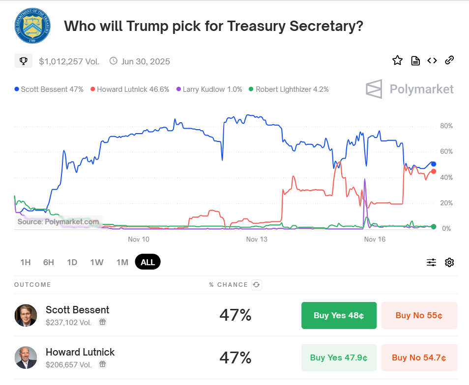 Lutnick ซีอีโอของ Cantor Fitzgerald กำลังแข่งขันกับ Scott Bessent ผู้ก่อตั้ง Key Square Group สำหรับตำแหน่งนี้ ทั้งสองคนต่างได้รับการยอมรับในท่าทีสนับสนุนคริปโต ทำให้การตัดสินใจนี้มีความสำคัญต่อภูมิทัศน์การเงินของสหรัฐอเมริกา