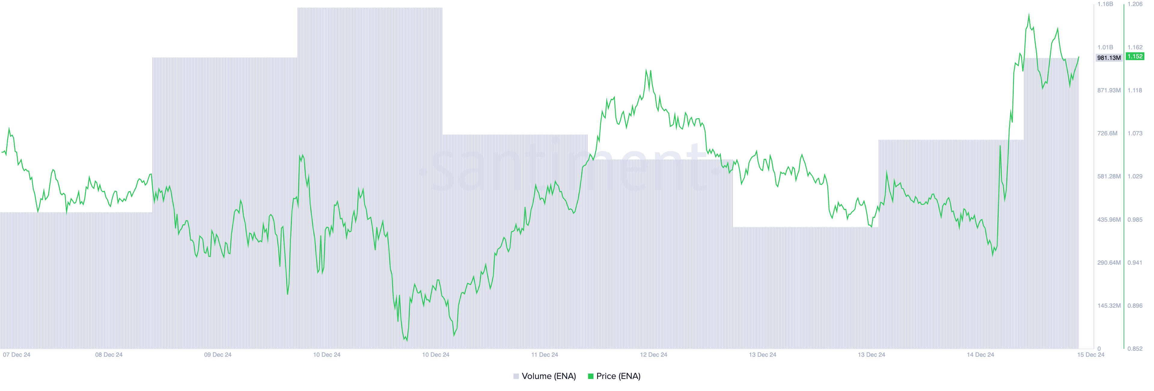 ในช่วง 24 ชั่วโมงที่ผ่านมา ปริมาณการซื้อขายของ ENA ได้เกิน 980 ล้านดอลลาร์ เพิ่มขึ้นถึง 166% เมื่อราคาของสินทรัพย์เพิ่มขึ้นพร้อมกับปริมาณการซื้อขายที่เพิ่มขึ้น แสดงถึงความสนใจของนักลงทุนและความเชื่อมั่นในตลาดต่อการแสดงของสินทรัพย์ในอนาคต การรวมกันนี้บ่งบอกว่าการเคลื่อนไหวของราคามีการสนับสนุนจากความต้องการที่แท้จริง ทำให้มีโอกาสสูงที่จะคงอยู่หรือดำเนินต่อไป